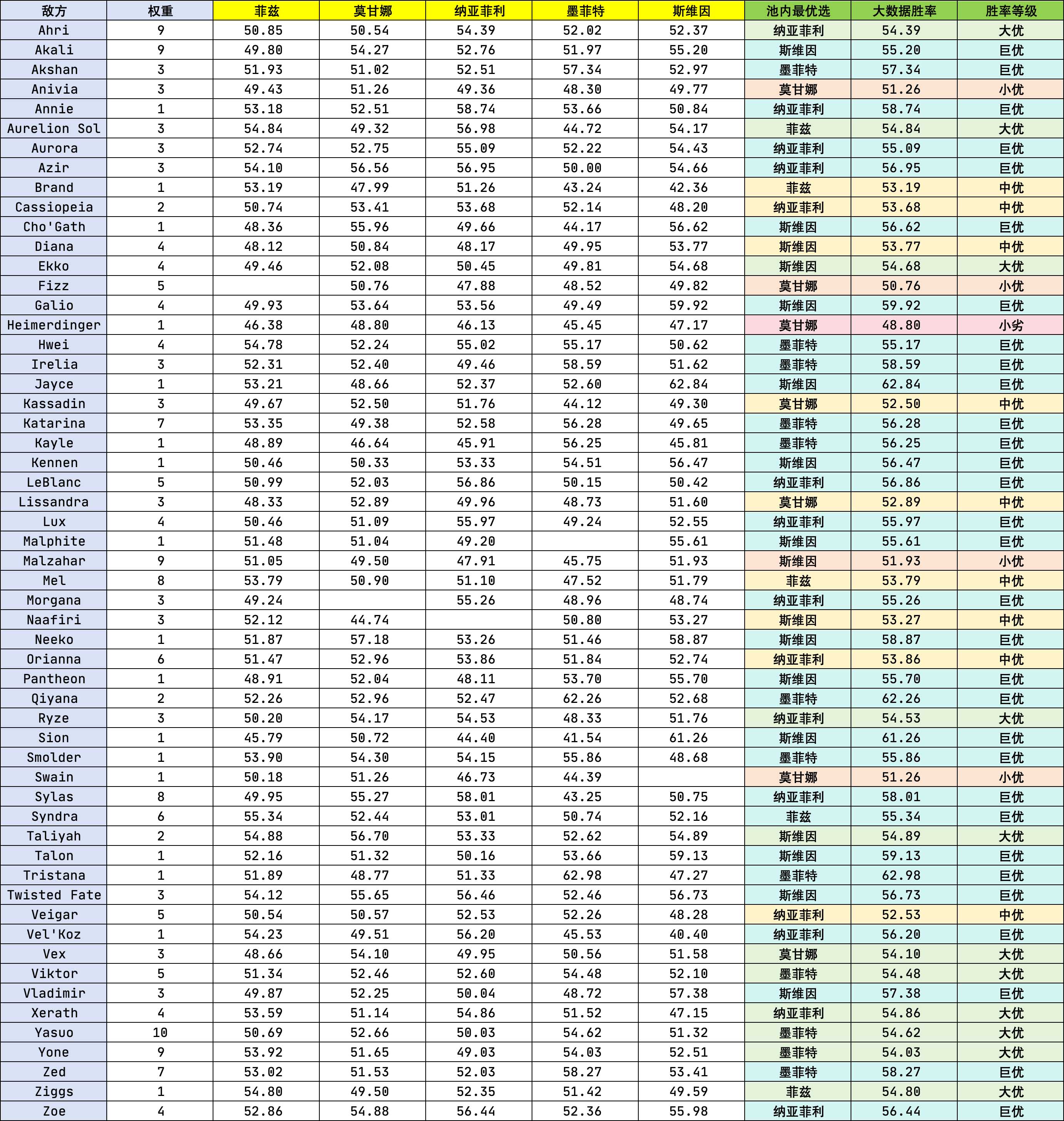 这套英雄池,对战全部56种中单的平均期望胜率高达55.67%,加权平均期望胜率高达55.19%。如果选择合理,打大多数主流中单都是大优,甚至巨优,基本就是爸爸打儿子。只有最冷门英雄之一的黑默丁格,并未处于优势。但为保证覆盖后整体加权后的优势最大化,是可接受的。